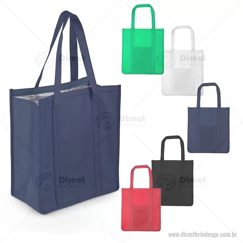 Sacola térmica confeccionada em TNT com gramatura de 80 g/m². Possui interior costurado com revestimento em algodão e folha de alumínio de 2 mm, auxiliando na conservação da temperatura de alimentos e bebidas. Conta com bolso frontal, fechamento em velcro e alça de 50 cm de ponta a ponta, proporcionando praticidade no transporte. - - DRTGOBT118