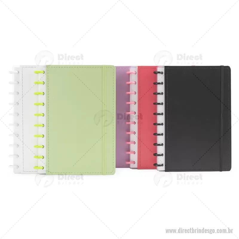 Caderno com capa dura em papelão, elástico para fechamento e encadernação em discos plásticos reposicionáveis, que permitem adicionar ou remover folhas compatíveis com praticidade. Possui aproximadamente 80 folhas brancas pautadas, ideal para anotações e organização do dia a dia. - - DRTGOCAD040