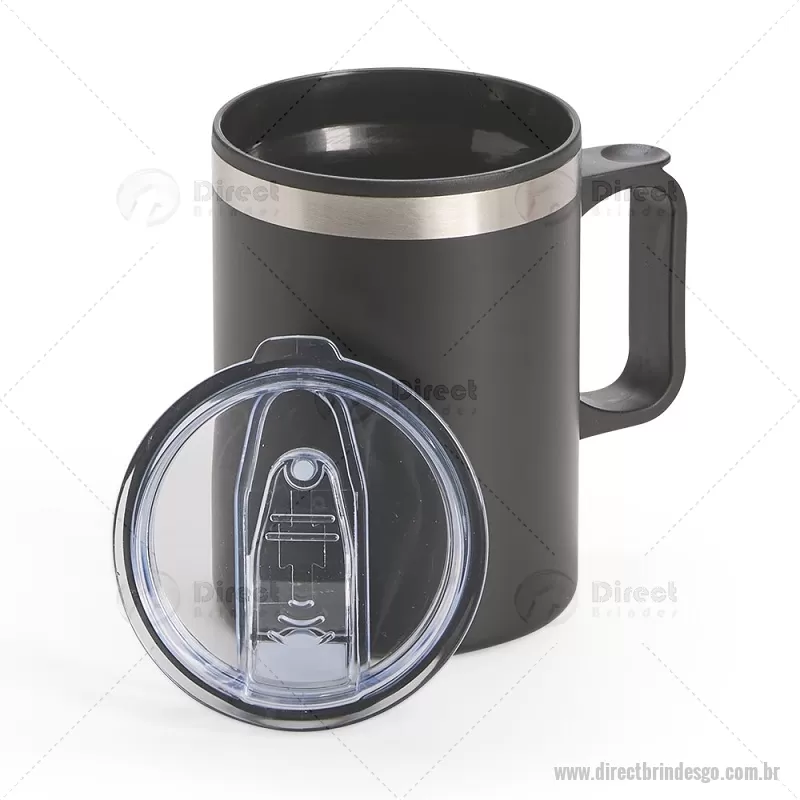 Caneca de 375 ml com interior plástico e revestimento externo em inox, que evita o aquecimento das mãos. Possui tampa com bocal e trava de segurança, além de base emborrachada antiderrapante. Prática e ideal para o dia a dia. - - DRTGOCAN098