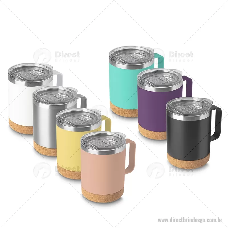 Caneca térmica em aço inox com parede dupla isolada à vácuo, tampa plástica e anel em silicone para vedação, alça lateral em inox na cor do produto, base em cortiça. Capacidade 350ml. - - DRTGOCAN076