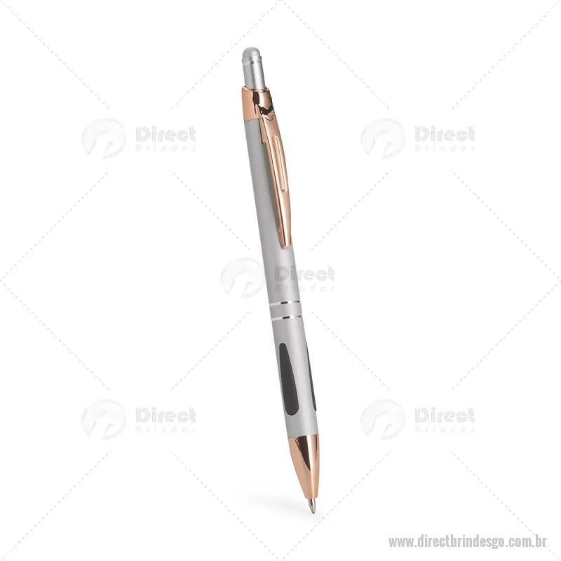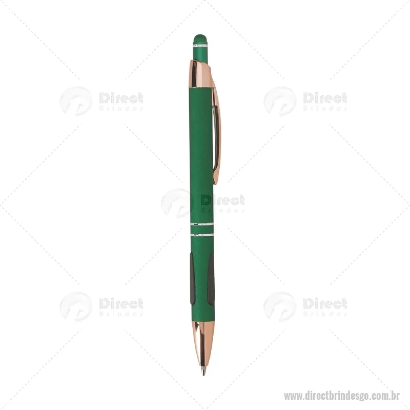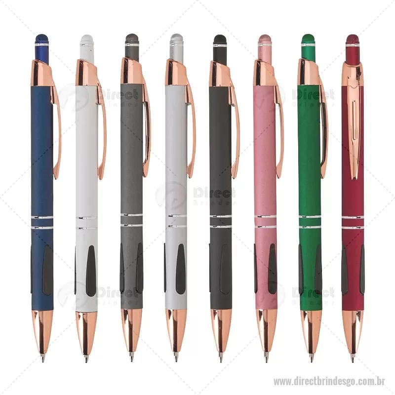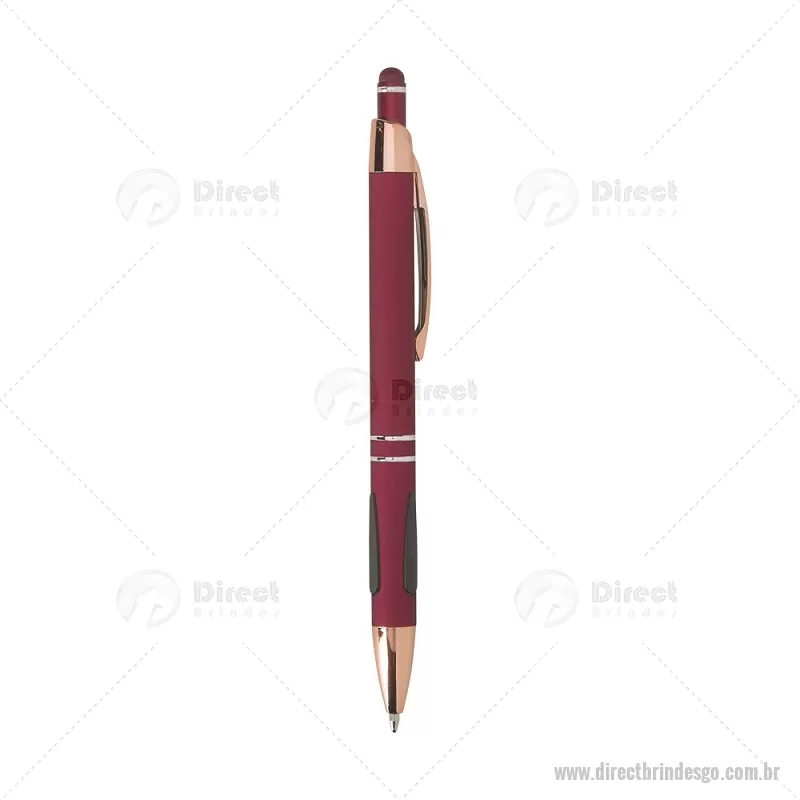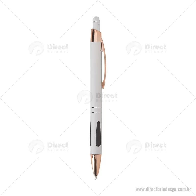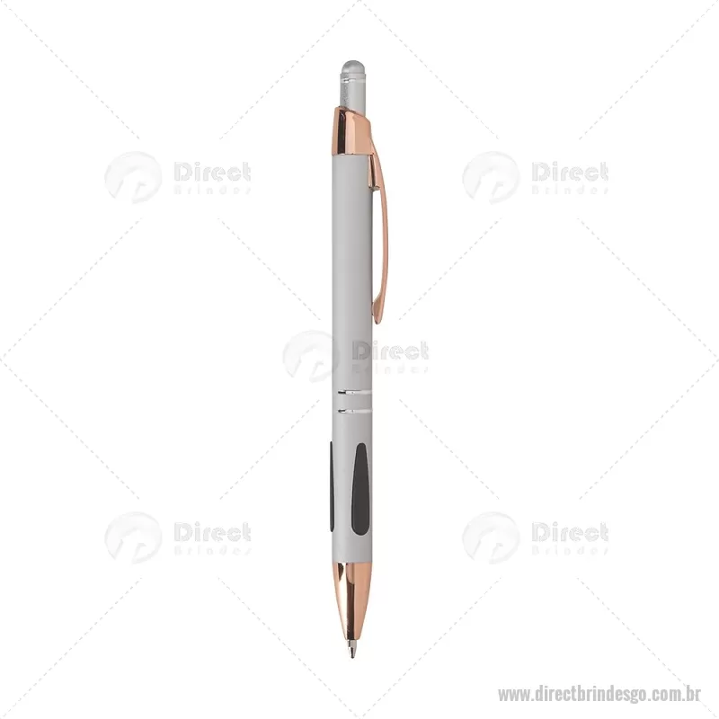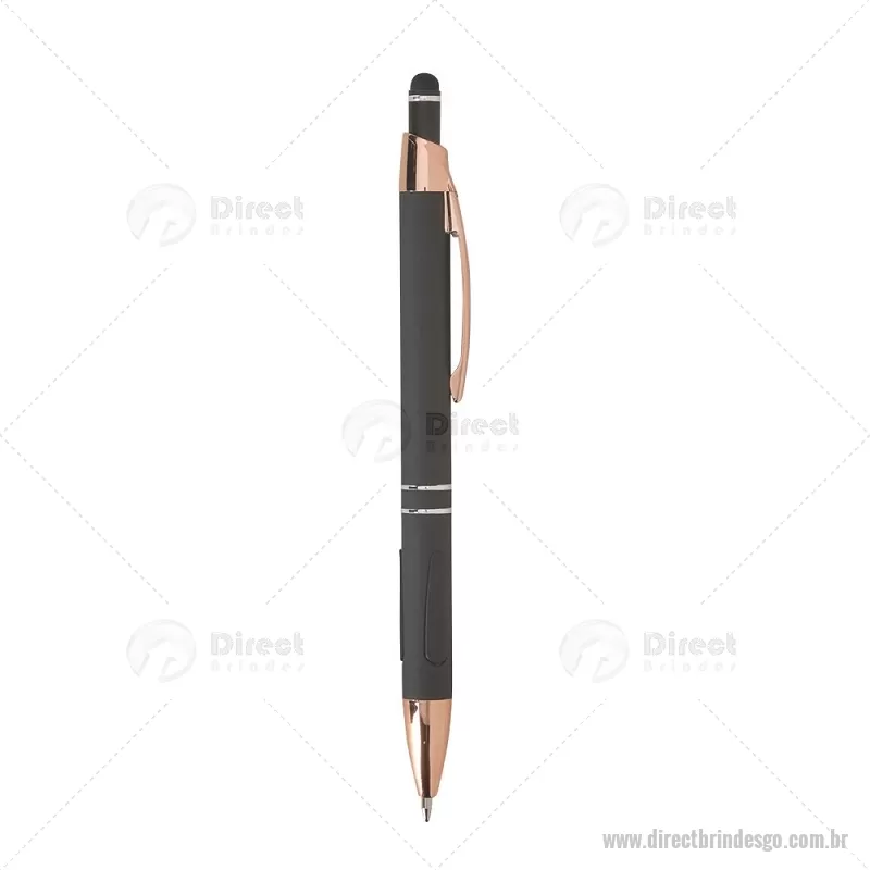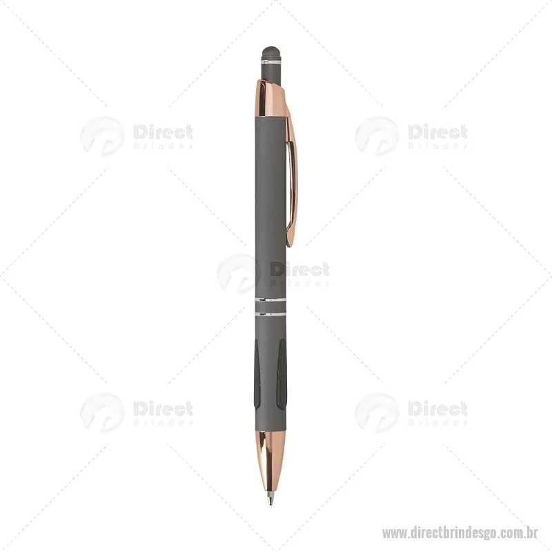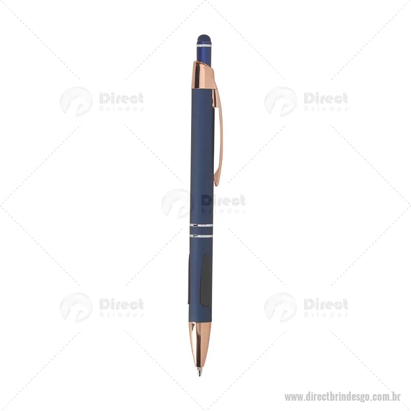 Caneta em metal com detalhes emborrachados, carga esferográfica azul 1,0 mm e acionamento por clique. Possui ponta touch emborrachada para uso em telas sensíveis ao toque, unindo escrita e praticidade em um só item. - - DRTGOCMT295