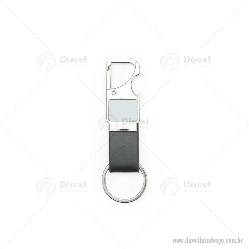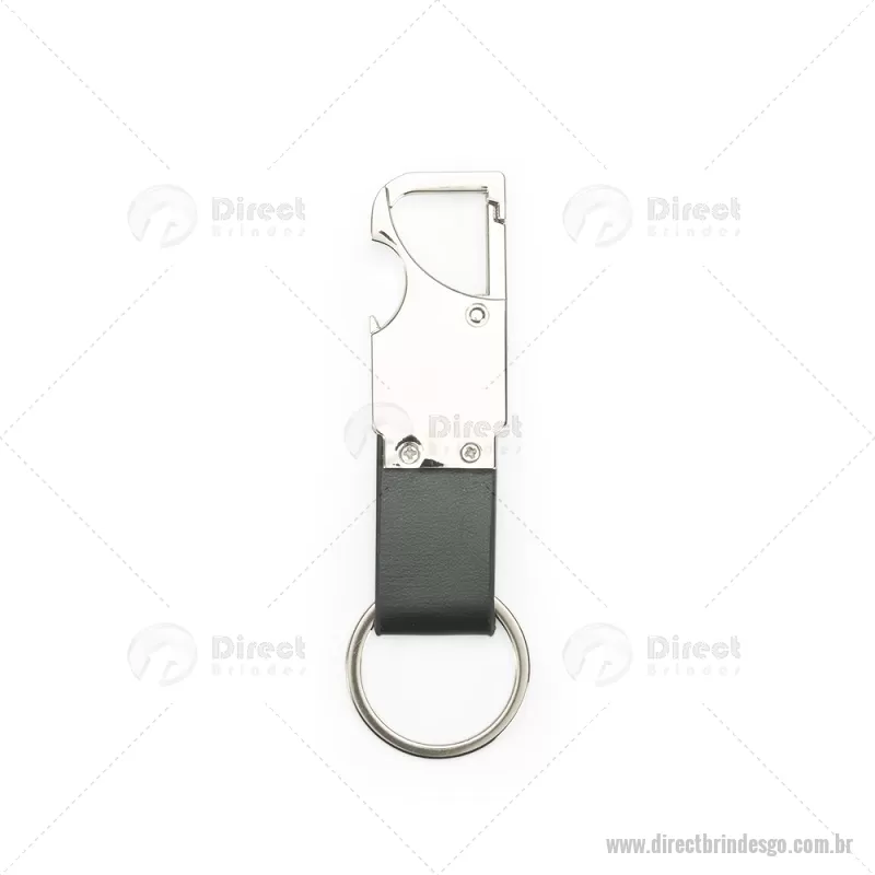 Chaveiro em metal com tira em couro sintético, equipado com mosquetão e função abridor de garrafas. Prático e funcional para o dia a dia. - - DRTGOCHV215