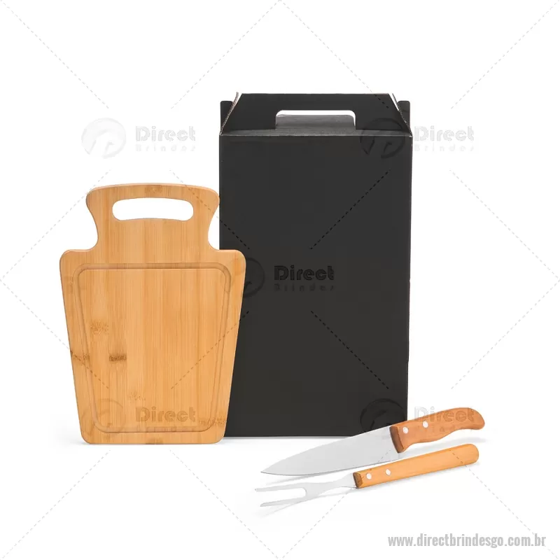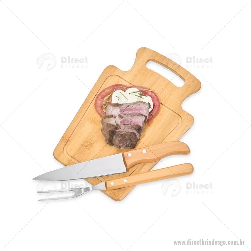 Conjunto Para Churrasco Em Bambu / Madeira / Inox - 3 Pçs Composto por tábua em Bambu com 30x21x1,2 cm; faca 7'' e garfo em Madeira/Inox. Dimensões do Produto Tábua: 30x21x1,3 cm Sugestão de Personalização Uma gravação a Laser na petisqueira e lâmina da faca; uma gravação em Silk/Digital na caixa. Embalagem : Caixa Preta 40x21,8x4,5 cm (AxLxP) Peso: 619 g (com embalagem) - - DRTGOKCH095