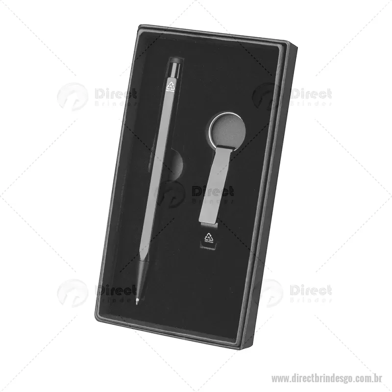 Conjunto caneta e chaveiro Conjunto composto por chaveiro pé de galinha em alumínio reciclado e caneta de acionamento em alumínio reciclado, com régua no corpo e sem clipe. Peso do Produto: 0,005kg (Chaveiro) Peso do Produto: 0,018kg (Caneta) Peso do Produto: 0,068kg (Caixa) Dimensão do Produto: 7,3x1,1cm (Chaveiro) Dimensão do Produto: 14,9xø0,9cm (Caneta) Dimensão do Produto: 2,5x17,3x9cm (Caixa) - - DRTGOKES082