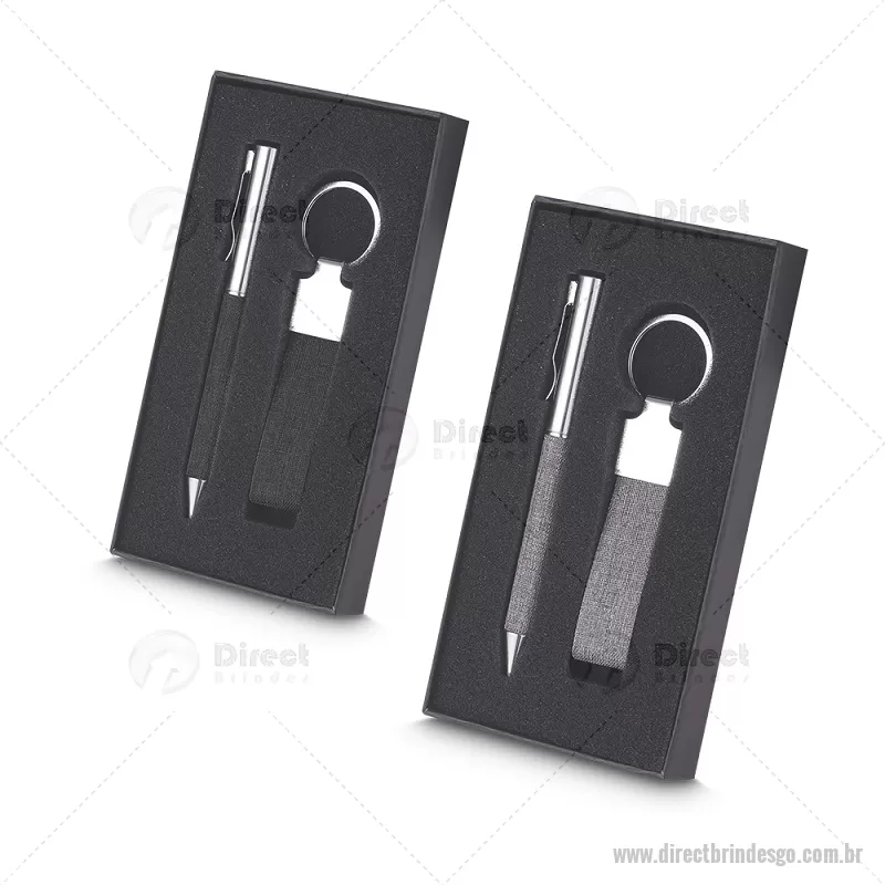 Kit Escritório, contendo: 1 Chaveiro em metal com detalhe em RPET reciclável; 1 Caneta Metálica com detalhe em RPET reciclável. Acompanha berço com espuma. Dimensão do produto: 17x9x2,5 cm (Embalagem) (AxøD) Dimensão do produto: 11,3x2,2 cm (Chaveiro)(AxøD) Dimensão do produto: 13xø1cm (Caneta)(AxøD) Peso do produto: 0,094kg - - DRTGOKES074