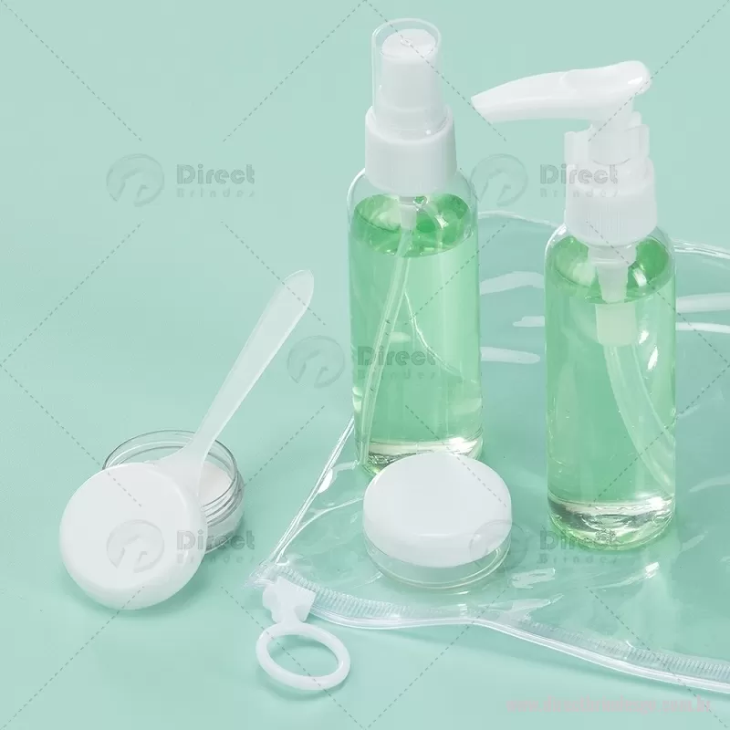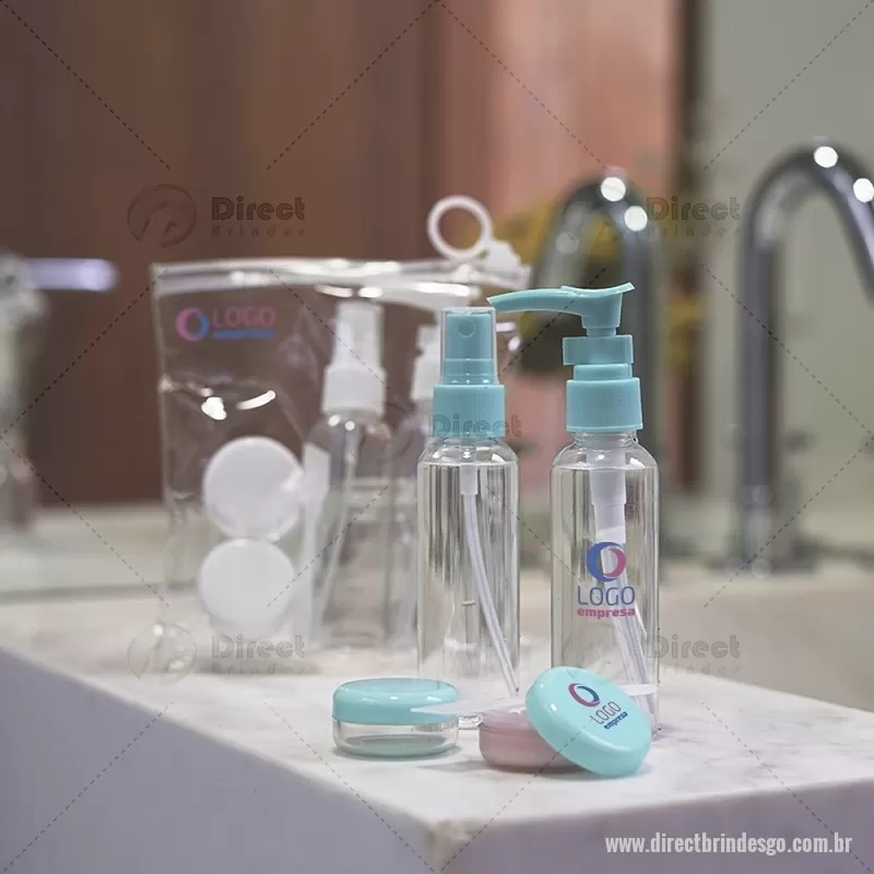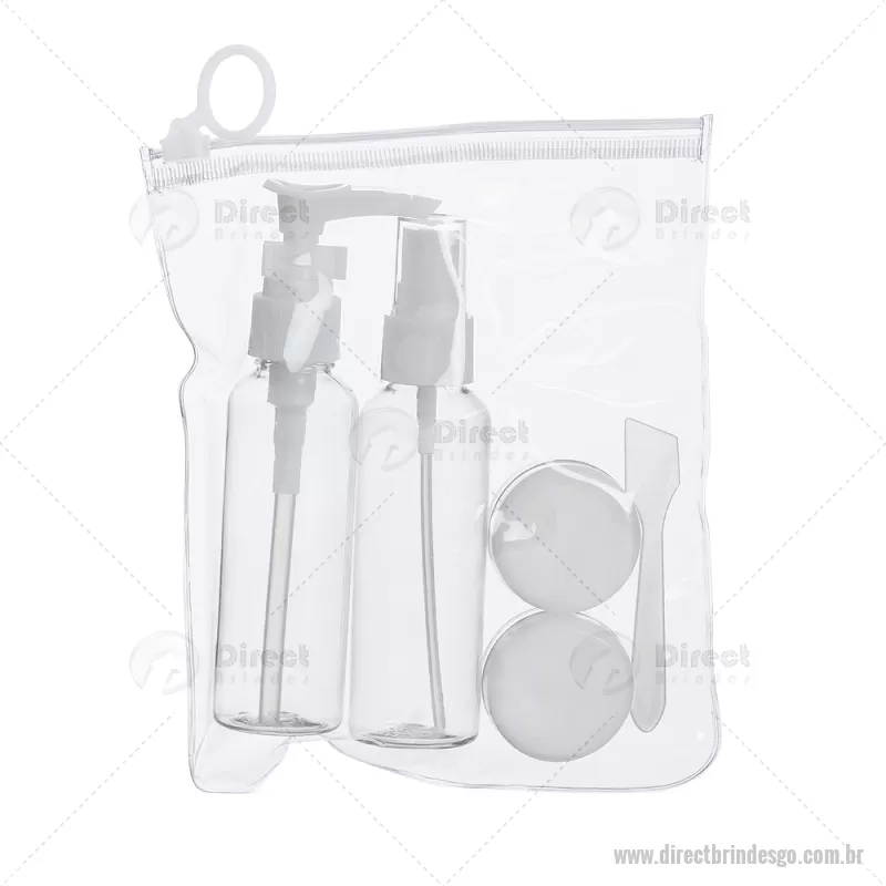 Kit Viagem 5 Peças Descrição: Kit viagem 5 peças em estojo ziplock. Contém frasco de 70ml com tampa spray; frasco de 70 ml com tampa pump; 2 potes de 10ml com tampa rosqueável e mini espátula fosca. Frascos plásticos e estojo em pvc com puxador plástico. Altura : 17,2 cm x Largura : 14,5 cm Peso aproximado (g): 61 - - DRTGOKVG017
