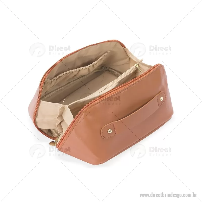 Nécessaire em PU impermeável com abertura em 180 graus, estilo concha, oferecendo fácil visualização dos itens. Possui compartimento interno amplo com dois bolsos laterais e um bolso central com zíper, além de alça para transporte. Ideal para organizar acessórios e produtos pessoais. - - DRTGONC146
