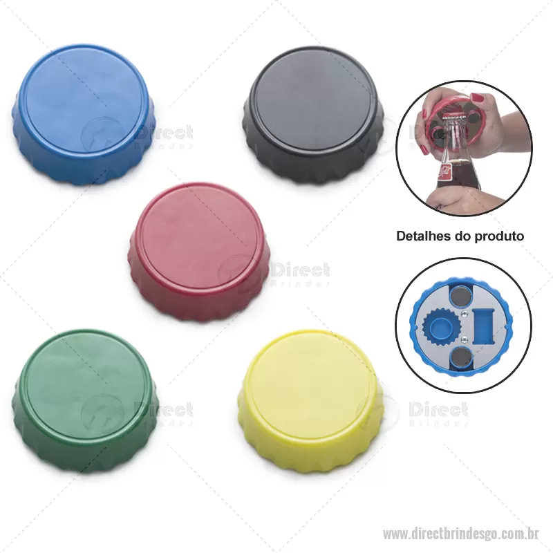 Abridor de garrafa formato tampa com contorno circular em relevo, material plástico resistente com imã de geladeira. Parte traseira possui compartimento metálico que pode abrir tampa de garrafa pet comum e também abrir tampas de metal. Gravação em silk screen. Ótima opção de brinde para festas, eventos corporativos e ações promocionais. - - DRTGOAB002
