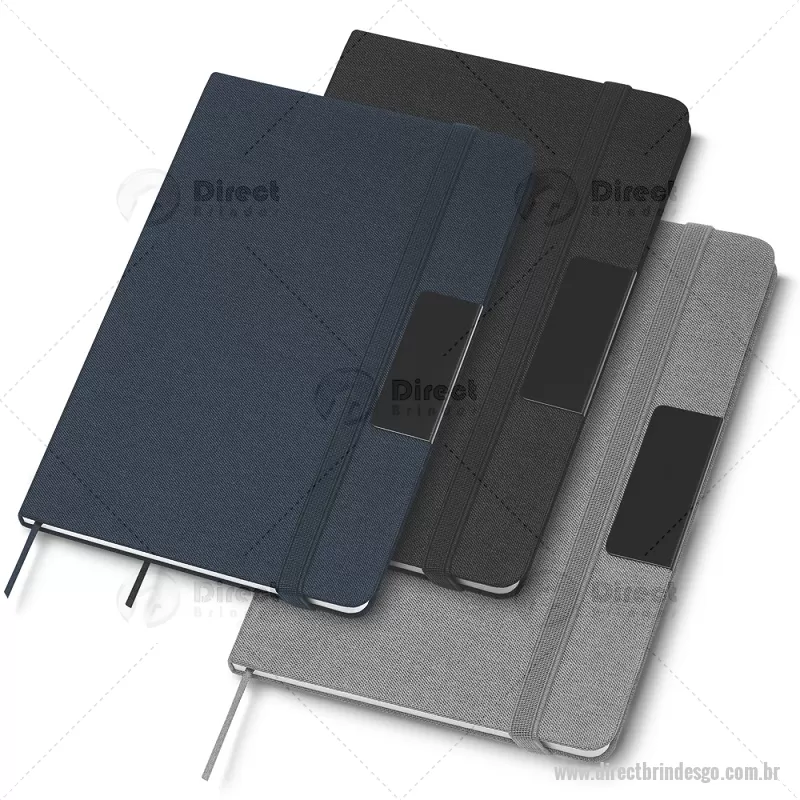 Caderno de anotações com placa de metal para personalização, fechamento em fita elástica, capa dura em material reciclável, miolo com 80 folhas pautadas na cor bege. NÃO ACOMPANHA CANETA. - - DRTGOBLC227