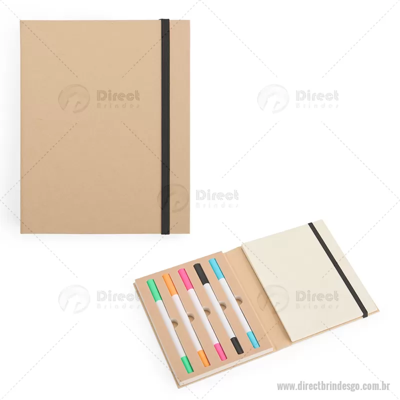 Bloco de anotações com capa dura em kraft e fechamento por elástico. Possui aproximadamente 80 folhas de tonalidade marfim sem pautas e cinco canetas coloridas de ponta dupla: uma fina e outra tipo pincel. Largura : 14,3 cm x Espessura : 2,3 cm x Comprimento : 18,1 cm Tamanho total aproximado (CxL): Caneta: 16,1 cm x 1 cm Peso aproximado (g): 247 - - DRTGOBLC280
