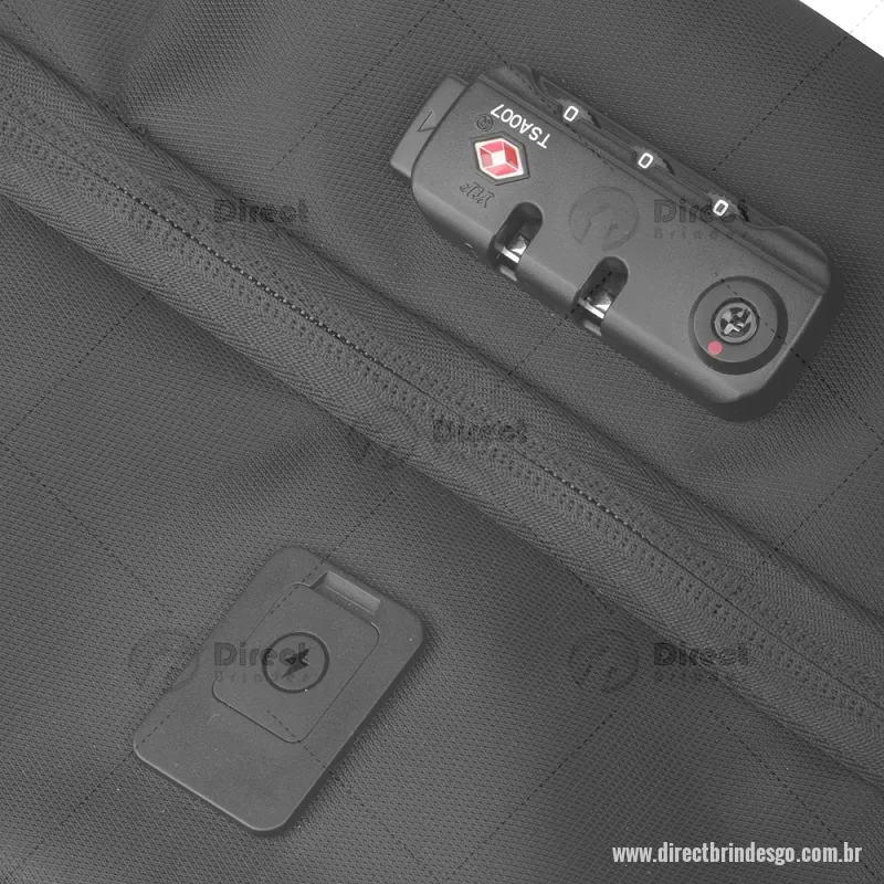Bolsa executiva em poliéster, compartimento interno com zíper, alça de ombro e mão, entrada usb, cadeado com senha/segredo, cadeado tipo TSA e compartimento para notebook de até 15,6". - - DRTGOBOL032