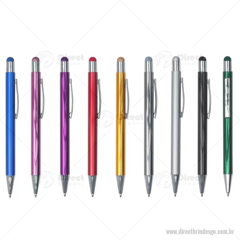 Caneta metal touch com detalhes prata. Clip metálico prata com “anel” superior e borracha touch colorida(mesma cor da caneta). Aciona por clique. - - DRTGOCMT197