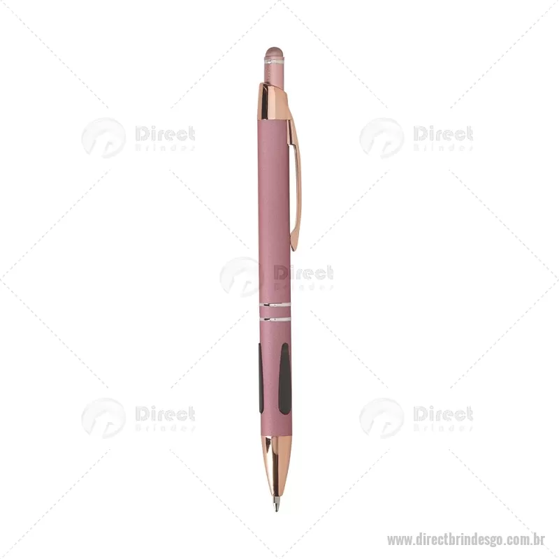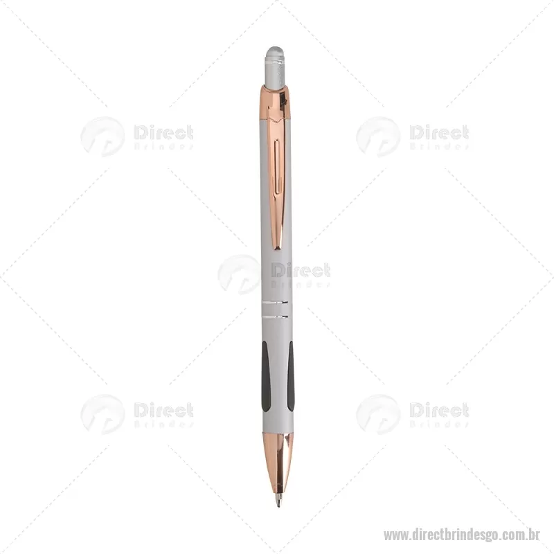 Caneta em metal com detalhes emborrachados, carga esferográfica azul 1,0 mm e acionamento por clique. Possui ponta touch emborrachada para uso em telas sensíveis ao toque, unindo escrita e praticidade em um só item. - - DRTGOCMT295