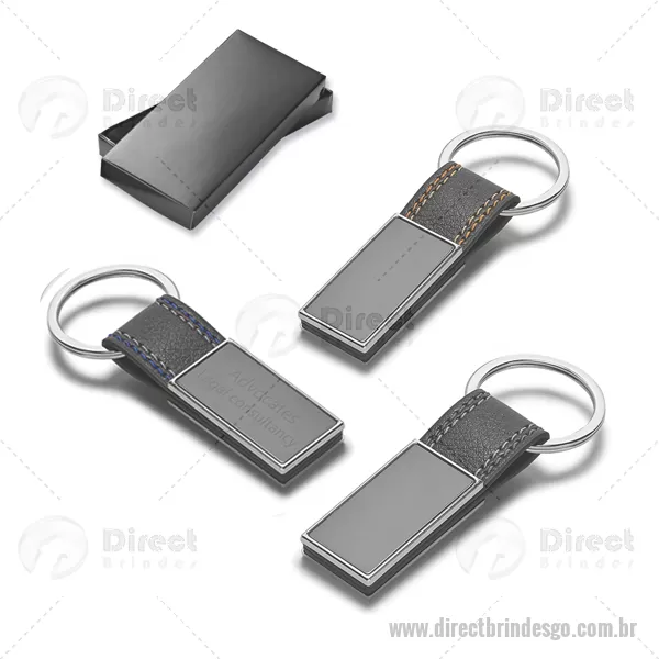 Chaveiro personalizável de metal com couro sintético. Acompanha embalagem cartonada preta. Gravação em Laser. - - DRTGOCHV049