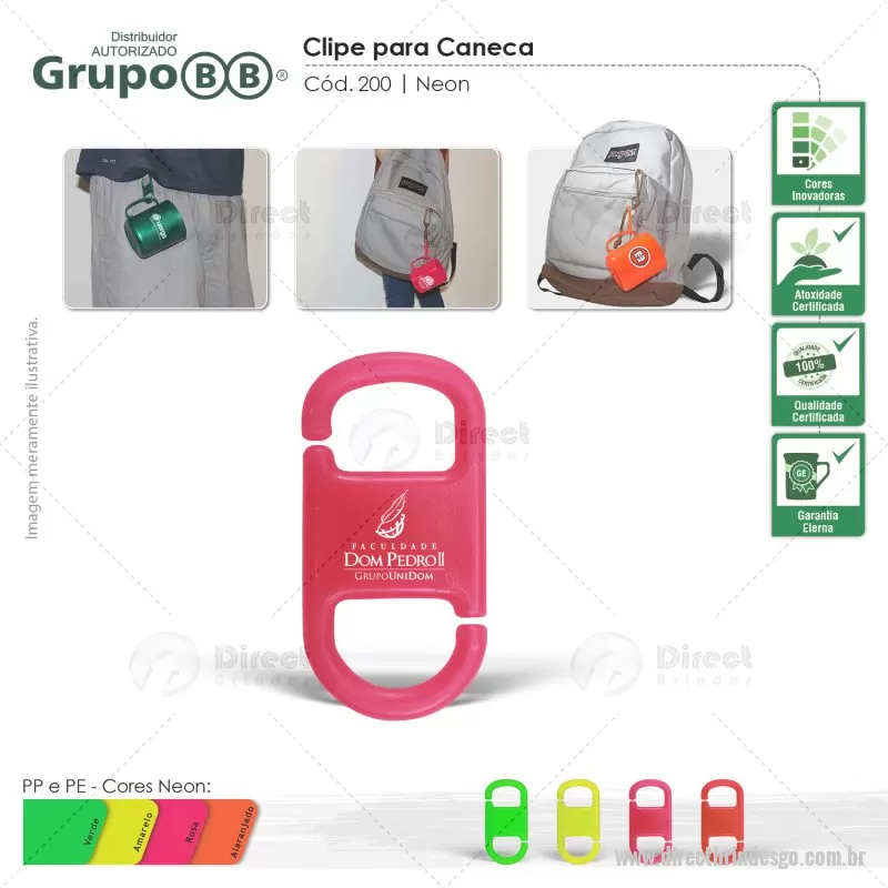 Clipe para caneca encaixável personalizado, fabricado em PP com alta resistência. Ideal para fixar em mochilas, cintura, para uso em eventos corporativos, ações promocionais, escolas, passeios e viagens. Cores Disponíveis - Linha Sólida: amarelo, branco, alaranjado, preto / Neon: Rosa, amarelo, verde, laranja / Metalizado: Azul, verde, vermelho, lilás, prata. Personalização 1 cor. Outras opções sob consulta. Distribuidor Autorizado Grupo BB. - - DRTGOZ200