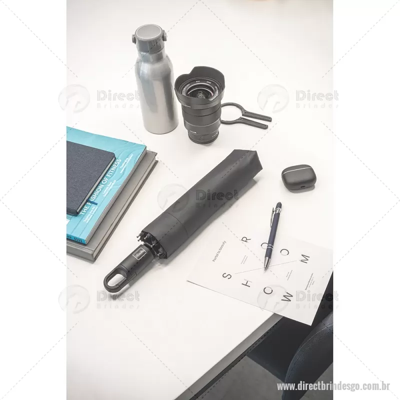 GUSTAVO. Guarda-chuva dobrável de 23'' em 100% poliéster reciclado pongee 190T (100% rPET) com abertura e fecho automático Guarda-chuva de 23'' em poliéster 100% reciclado pongee 190T, com varetas em fibra de vidro, haste metálica e pega em ABS 35% reciclado. O guarda-chuva, dobrável em 3 seções, tem abertura e fecho automático e é à prova de vento. Fornecido em bolsa. Medidas: ø1050 x 330 mm | Sacola: ø50 x 250 mm Peso do Produto (g.): 380 - - DRTGOGCH052
