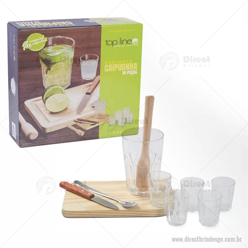 Kit caipirinha 10 peças. Produto ecologicamente correto, feito com madeira de reflorestamento. Conjunto Caipirinha 10 Peças é prático e bem completo. São peças fáceis de usar e de alta qualidade para tornar a caipirinha ainda mais saborosa. Contém: 1 copo de vidro – 400 ml; 5 copos de vidro – 60 ml; 1 socador de madeira – 19 cm; 1 prancha de madeira – 22 cm x 14 cm x 1,5 cm; 1 colher de inox – 18 cm; 1 faca inox 3″ com cabo de madeira - - DRTGOKCP002