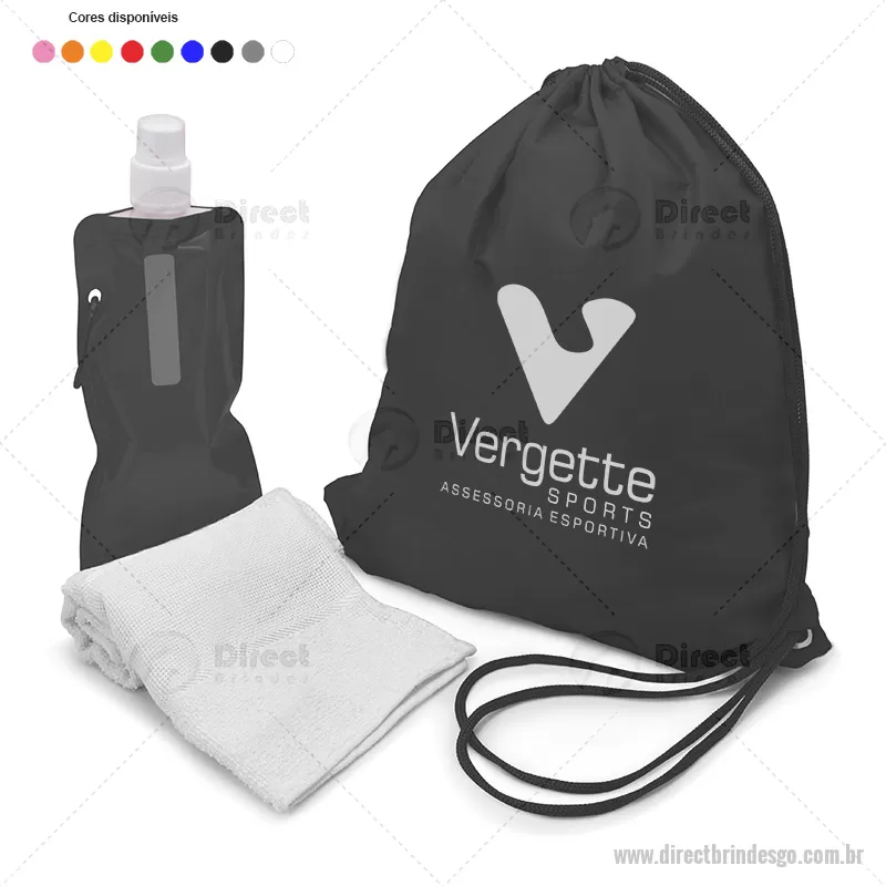 Kit fitness com 3 pçs personalizado. Ideal para aquele treino diário. Contém * 1 Saco de nylon, * 1 Squeeze dobrável com mosquetão e * 1 Toalha fitness. Ótima opção de brinde para ações promocionais. - - DRTGOKF004