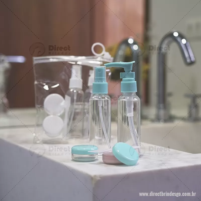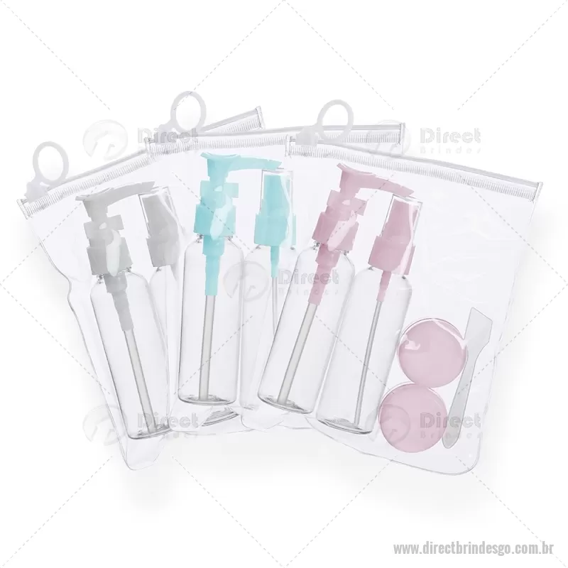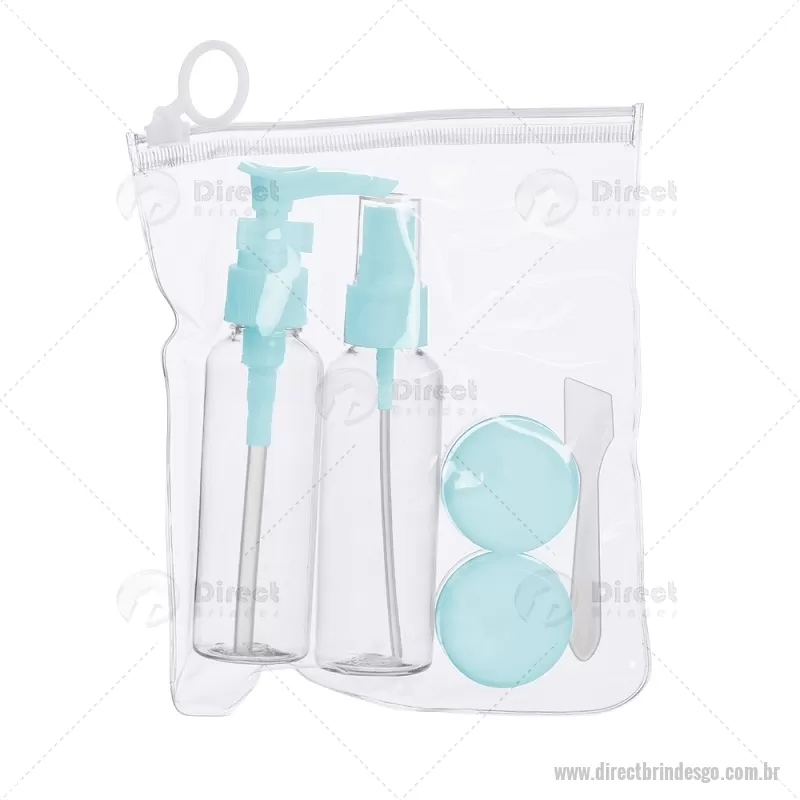 Kit Viagem 5 Peças Descrição: Kit viagem 5 peças em estojo ziplock. Contém frasco de 70ml com tampa spray; frasco de 70 ml com tampa pump; 2 potes de 10ml com tampa rosqueável e mini espátula fosca. Frascos plásticos e estojo em pvc com puxador plástico. Altura : 17,2 cm x Largura : 14,5 cm Peso aproximado (g): 61 - - DRTGOKVG017