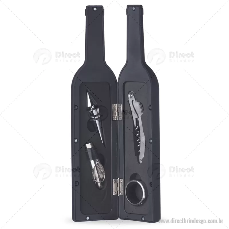 Kit vinho formato garrafa com 4 peças: tampa de bico, bico condutor com tampa, saca rolhas metálico com lâmina de corte e abridor de garrafa e wine collar. Estojo com fechamento imantado e área interna com berço de espuma. Altura : 32,4 cm x Largura : 7,2 cm Peso aproximado (g): 352 - - DRTGOKVI043
