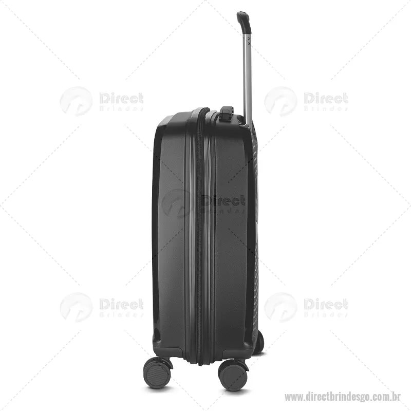 Mala de viagem em plástico PP. Abertura frontal com ziper para acesso ao interior da mala; Forro poliéster; Sistema de carrinho de aço; Alça de mão na parte superior; Quatro rodas de 360 graus; Acompanha Plaquinha de metal sem personalização. - - DRTGOMC200