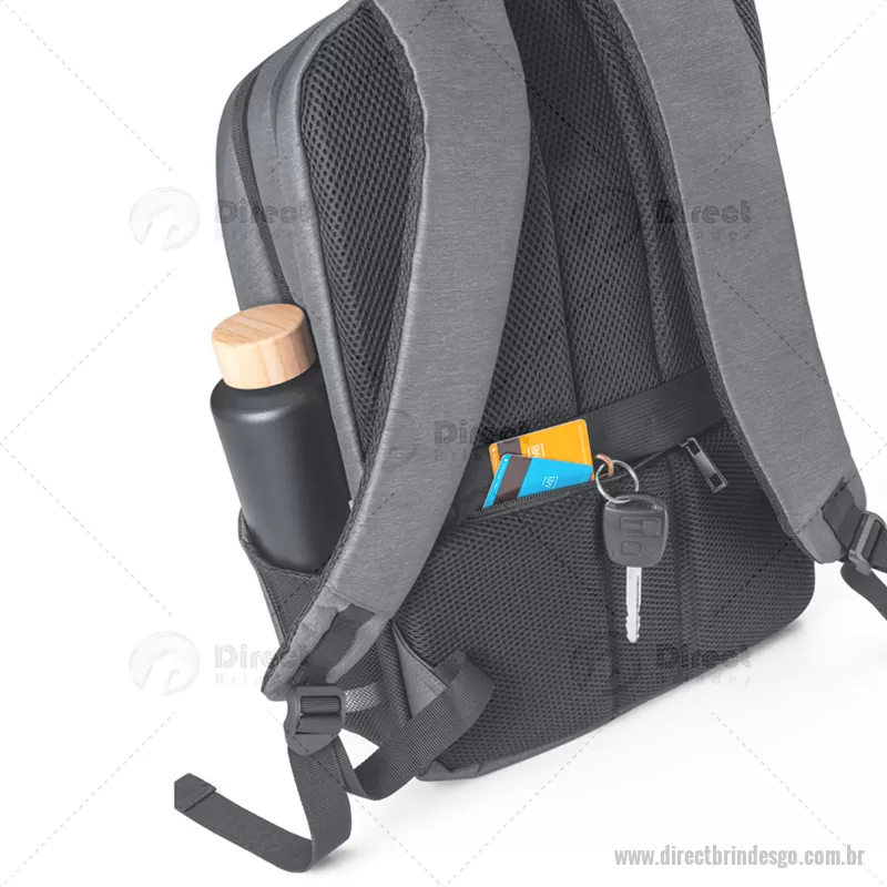 Mochila para notebook em Nylon 2Tone impermeável com 2 compartimentos e alças almofadadas. O compartimento posterior tem 2 divisórias almofadadas com fecho em velcro para notebook até 17'' e tablet até 10.5''. Compartimento frontal com diversos bolsos interiores. Contém dois bolsos na parte frontal, tendo um deles bloqueio RFID. Nas laterais existe um bolso para garrafas em elastano e outro para o guarda chuva, com ilhós perfurados para evitar acumulação de água. A parte detrás almofadada tem bolso oculto e banda para transporte em trolley. Placa metálica removível com iman, para fácil gravação. 320 x 450 x 140 mm - - DRTGOMC174