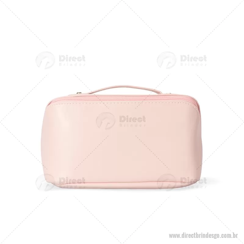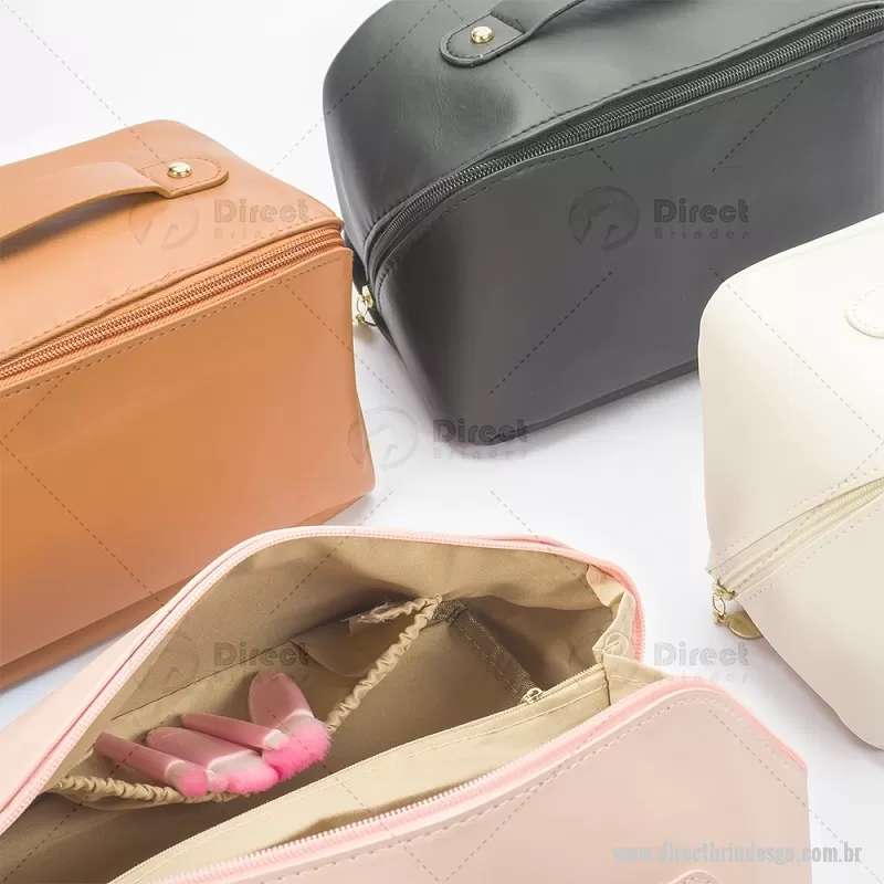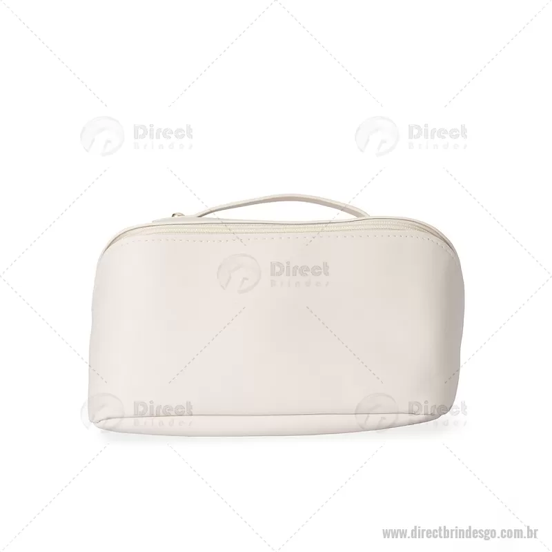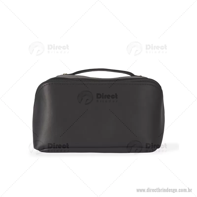 Nécessaire em PU impermeável com abertura em 180 graus, estilo concha, oferecendo fácil visualização dos itens. Possui compartimento interno amplo com dois bolsos laterais e um bolso central com zíper, além de alça para transporte. Ideal para organizar acessórios e produtos pessoais. - - DRTGONC146