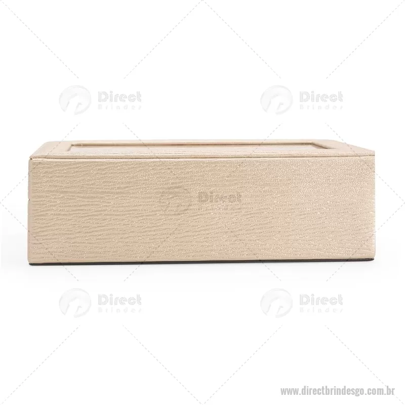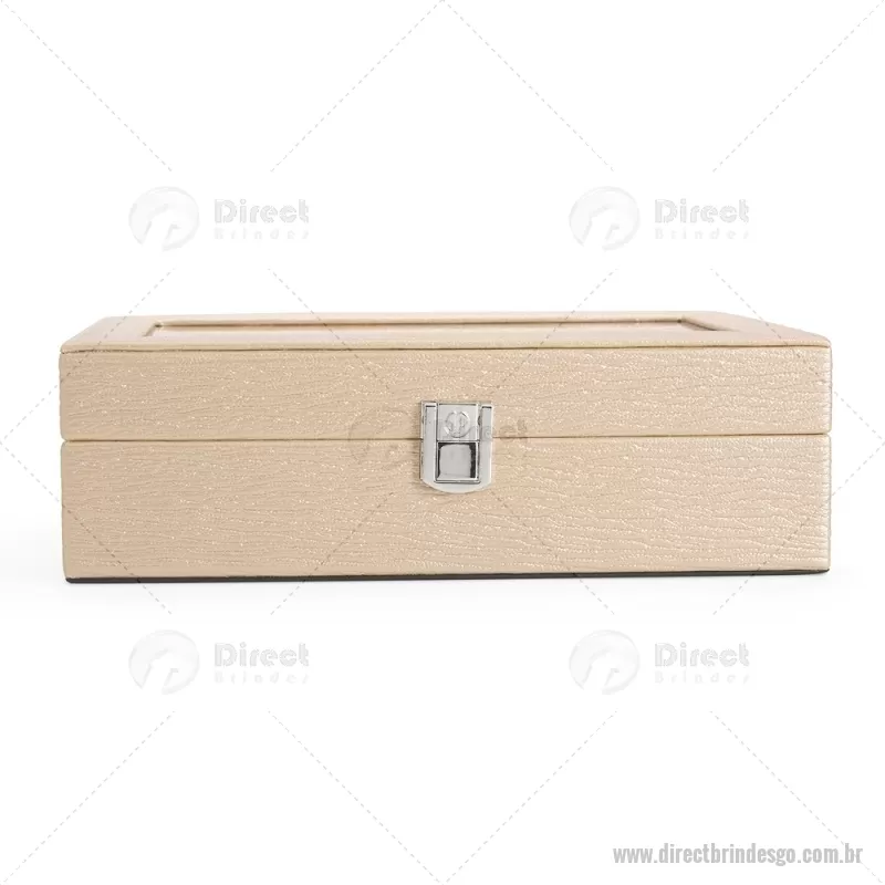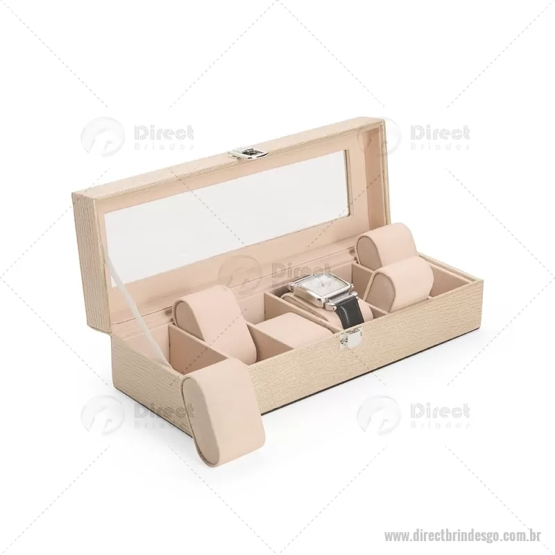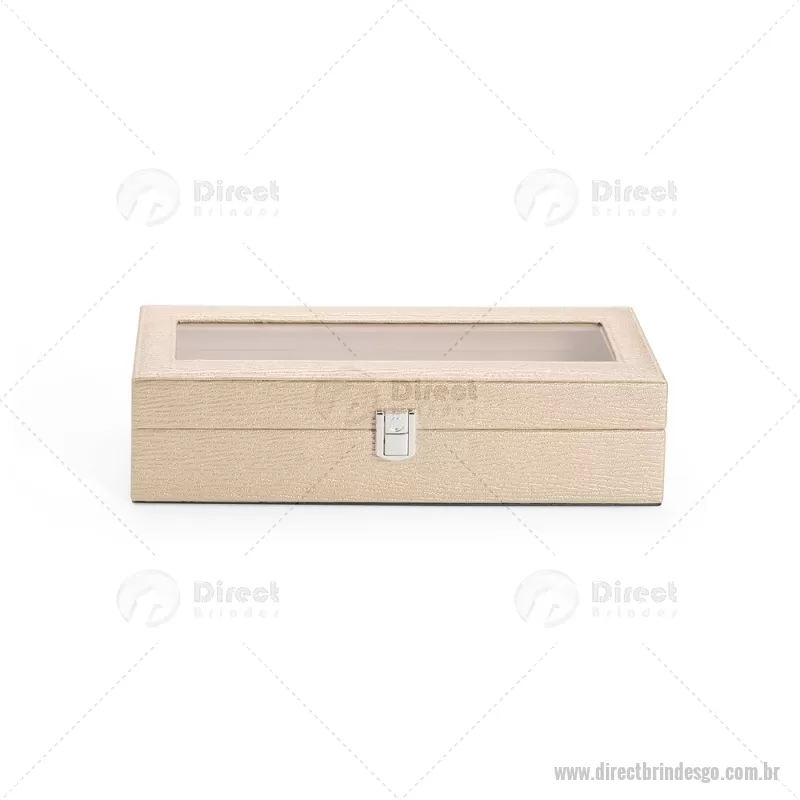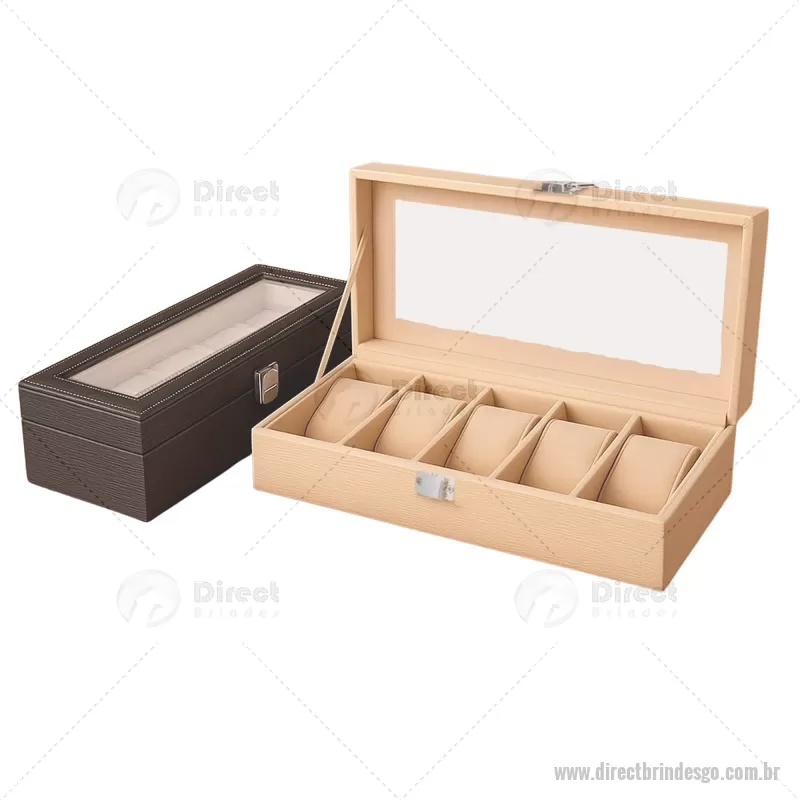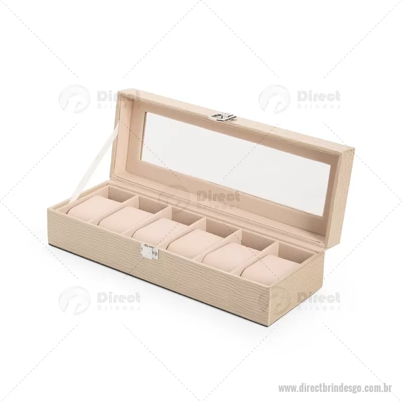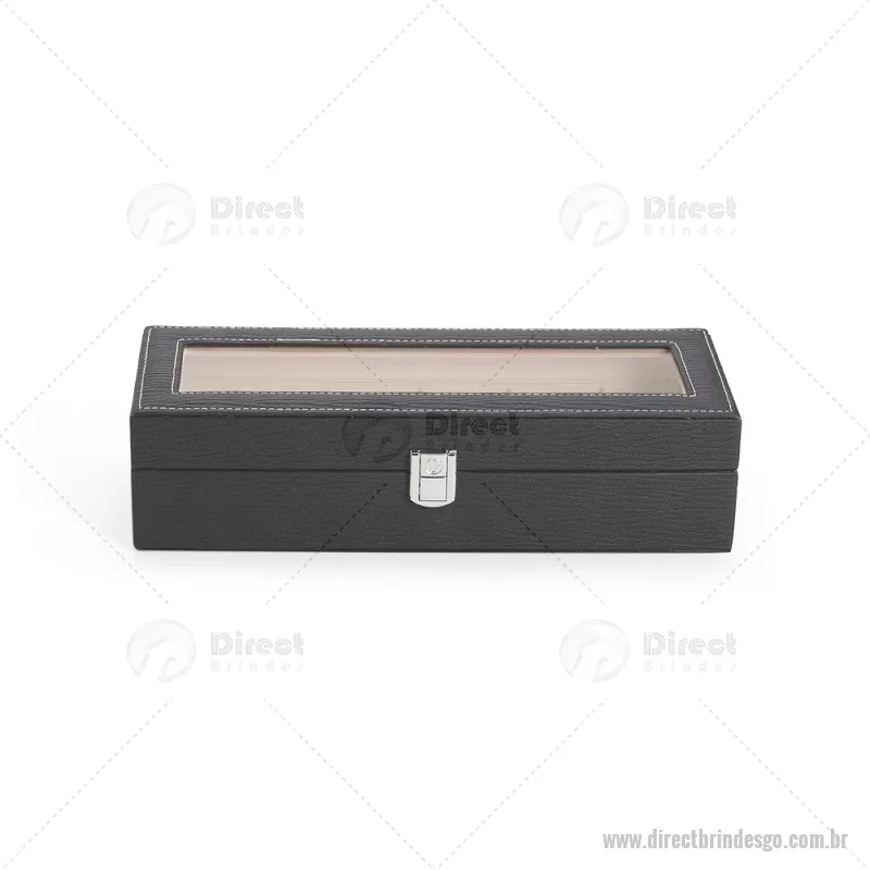 Porta-relógios com acabamento em couro sintético texturizado à base de PVC e interior revestido em tecido aveludado. Possui seis compartimentos com almofadas removíveis, visor em vidro transparente e trava de segurança, ideal para organizar e proteger relógios com elegância. - - DRTGOPREL004